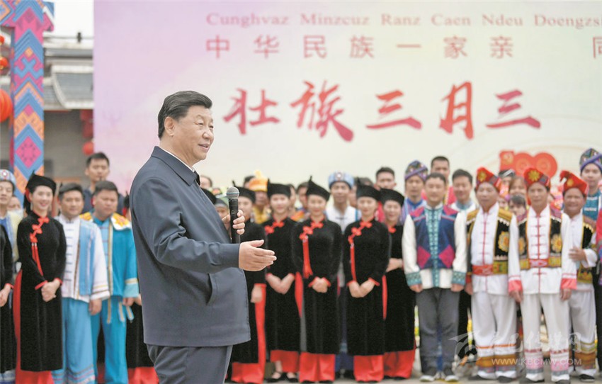 廣西是我國少數(shù)民族人口最多的自治區(qū)。27日上午,習近平來到位于南寧市邕江之畔的廣西民族博物館,參觀壯族文化展。博物館外,三月三“歌圩節(jié)”壯族對歌等民族文化活動正在這里集中展示。習近平強調,廣西是全國民族團結進步示范區(qū),要繼續(xù)發(fā)揮好示范帶動作用。各民族共同團結進步、共同繁榮發(fā)展是中華民族的生命所在、力量所在、希望所在,在全面建設社會主義現(xiàn)代化國家的新征程上,一個民族都不能少,各族人民要心手相牽、團結奮進,共創(chuàng)中華民族的美好未來,共享民族復興的偉大榮光。