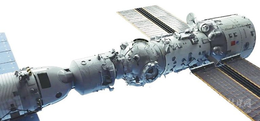 15時54分,飛船采用自主快速交會對接模式,成功對接于天和核心艙前向端口,與此前已對接的天舟二號貨運飛船一起構(gòu)成三艙(船)組合體,歷時約6.5小時。