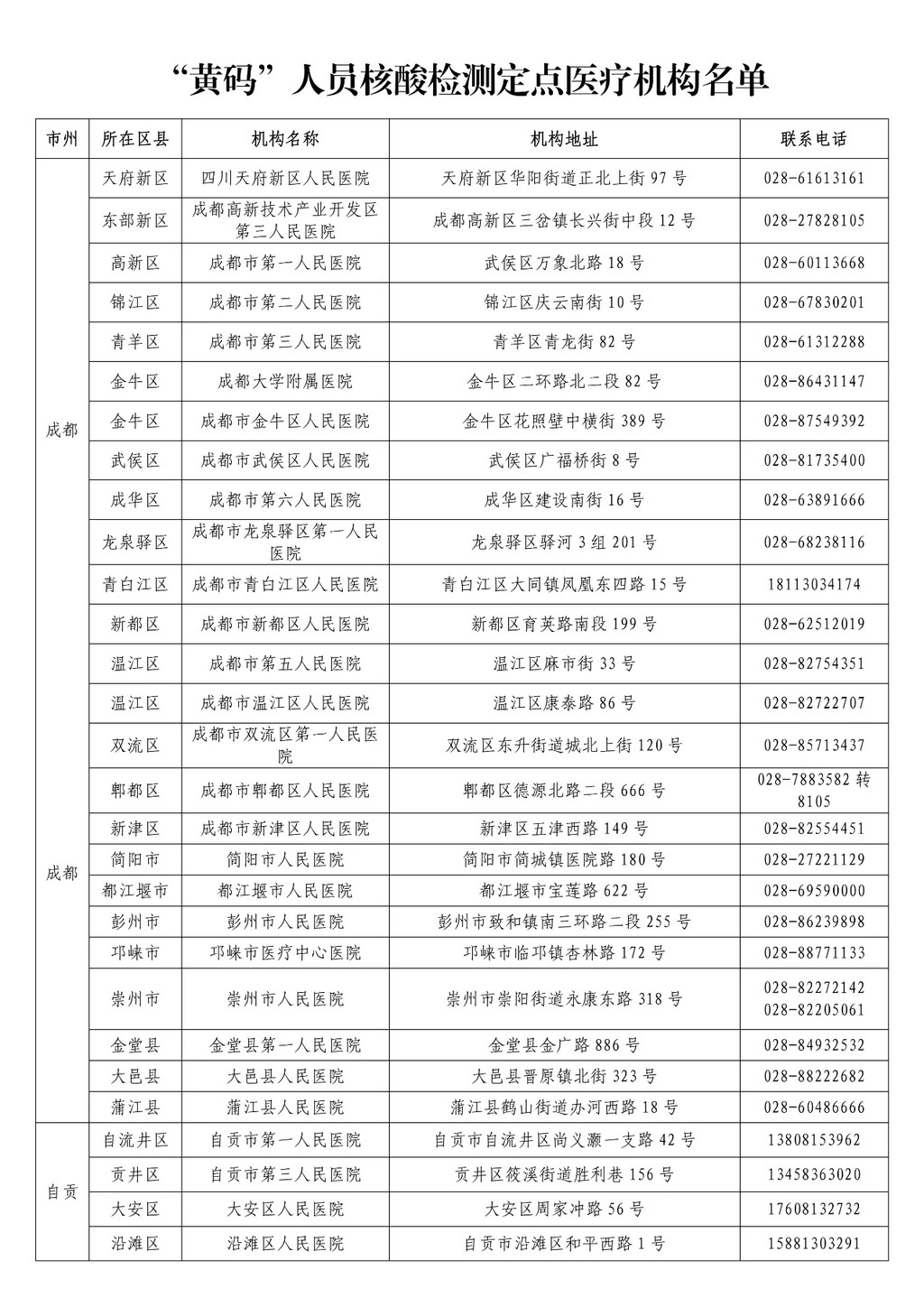 1. “黃碼”人員核酸檢測定點醫(yī)療機構(gòu)名單