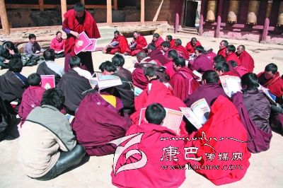 德格縣滿金寺僧人正在閱讀群眾工作特刊藏文版。(本報(bào)資料照片)