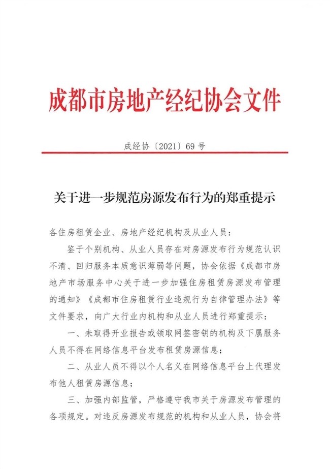 第三,加強(qiáng)內(nèi)部監(jiān)管,嚴(yán)格遵守成都市關(guān)于房源發(fā)布管理的各項規(guī)定。對違反房源發(fā)布規(guī)范的機(jī)構(gòu)和從業(yè)人員,該協(xié)會將依據(jù)行業(yè)自律規(guī)范文件予以相應(yīng)懲戒。