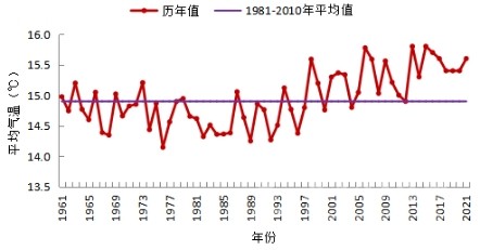 1961—2021年四川省年平均氣溫逐年變化