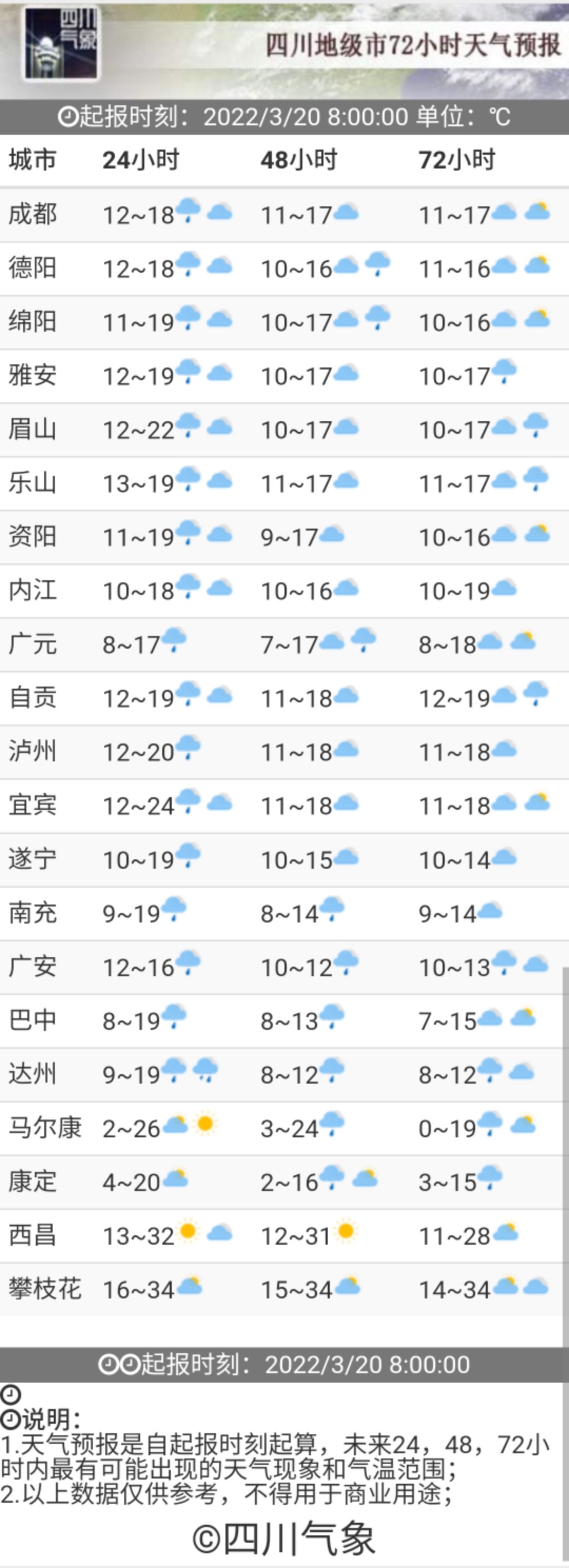 早在3月18日,四川省氣象臺(tái)便發(fā)出了強(qiáng)降溫黃色預(yù)警。預(yù)計(jì)19日傍晚~22日,盆地和涼山州東北部將有一次明顯的降溫降雨天氣過程,日平均氣溫將累計(jì)下降7~12℃,最高氣溫將下降15℃或以上;冷空氣影響時(shí)有3-5級偏北風(fēng),山口河谷風(fēng)力可達(dá)6級或以上,局部地方有短時(shí)強(qiáng)降水、雷暴大風(fēng)或冰雹等強(qiáng)對流天氣,其中盆地東北部、中部和南部有大雨到暴雨。