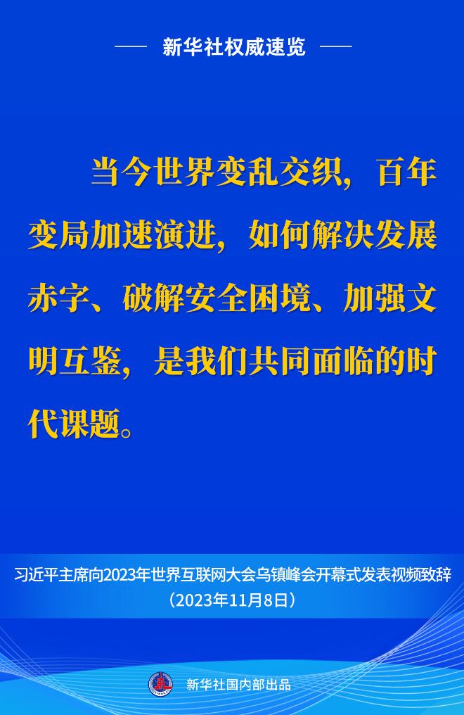 11月8日上午,國家主席習(xí)近平向2023年世界互聯(lián)網(wǎng)大會烏鎮(zhèn)峰會開幕式發(fā)表視頻致辭。一起來看金句。