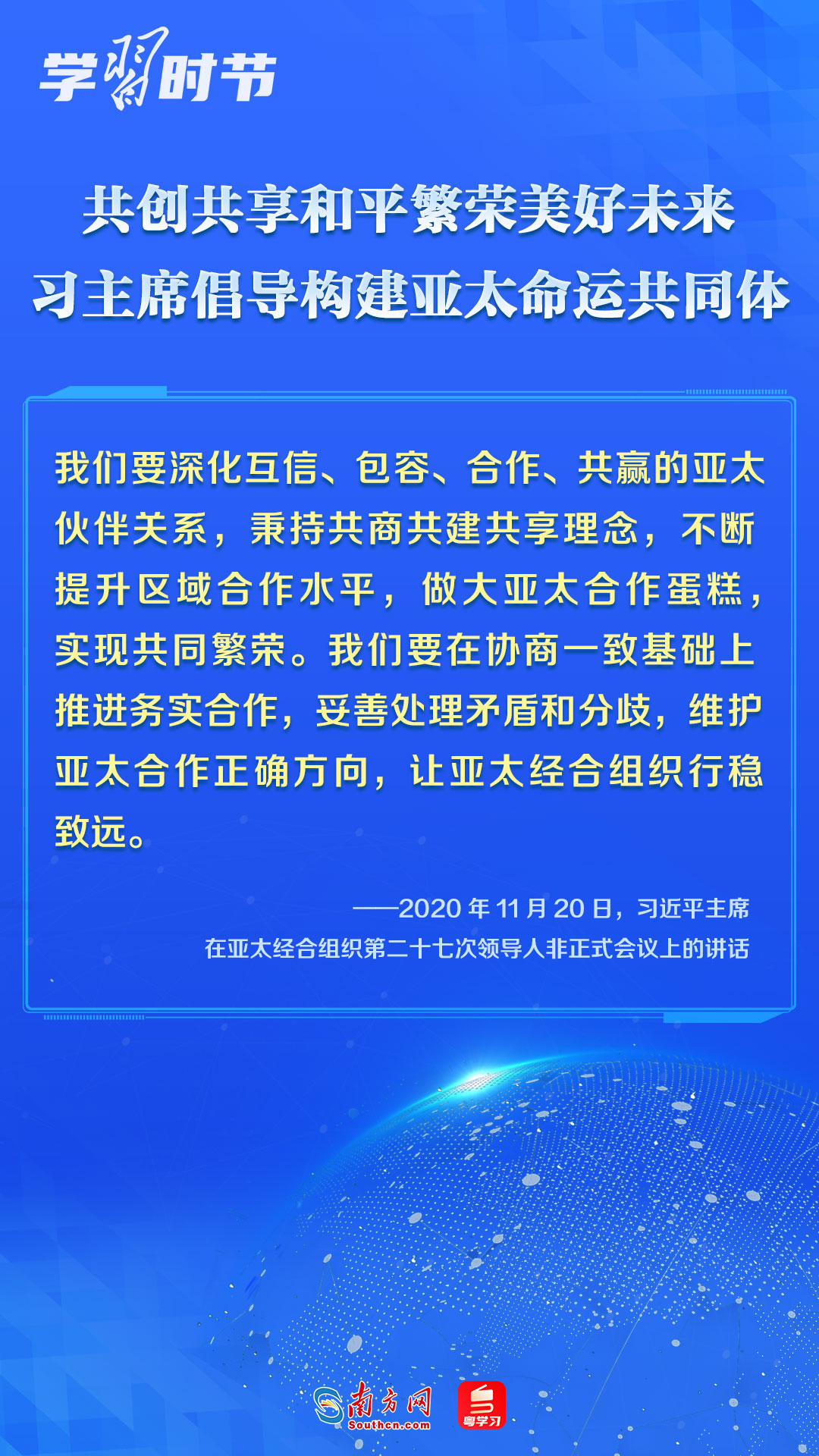 中國一直是APEC的積極參與者、貢獻(xiàn)者,為推動建設(shè)亞太大家庭發(fā)揮了重要作用。習(xí)近平主席多次出席APEC會議,以中國主張促進(jìn)亞太合作,以中國貢獻(xiàn)推動亞太發(fā)展,以中國智慧凝聚亞太共識,多次闡述構(gòu)建開放包容、創(chuàng)新增長、互聯(lián)互通、合作共贏的亞太命運共同體的理念主張和重大意義,讓我們一同學(xué)習(xí)。