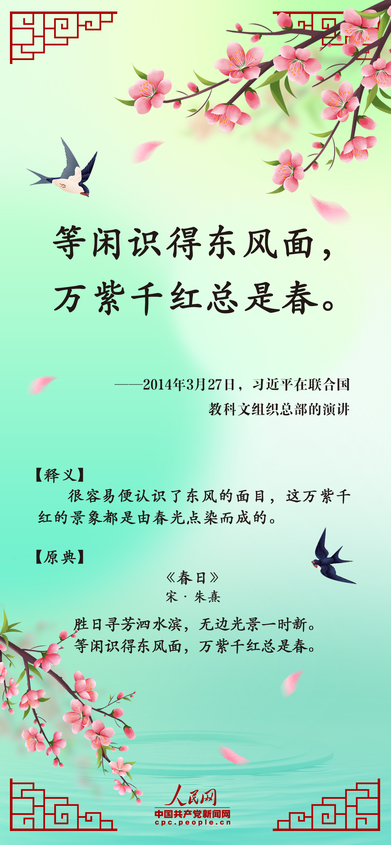 春是新的開始,是萬(wàn)物生發(fā)、欣欣向榮的美好時(shí)節(jié)。習(xí)近平總書記曾多次引經(jīng)據(jù)典,用詩(shī)文名句展現(xiàn)生機(jī)盎然的春天景象。一年之計(jì)在于春,一起領(lǐng)會(huì)中華傳統(tǒng)文化的深刻內(nèi)涵,凝聚蓬勃向上的發(fā)展之力。