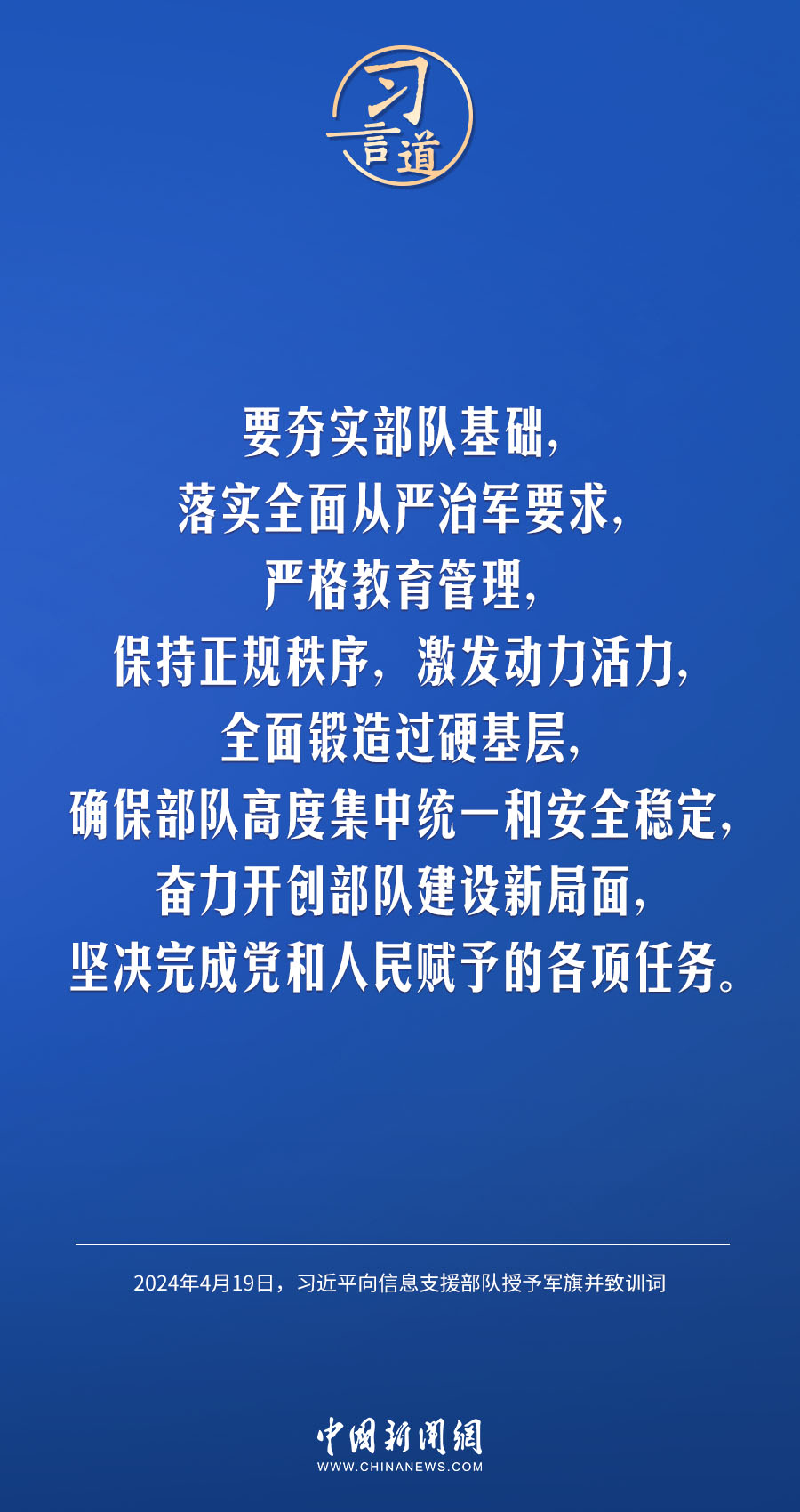 中國人民解放軍信息支援部隊成立大會19日在北京八一大樓隆重舉行。中共中央總書記、國家主席、中央軍委主席習(xí)近平向信息支援部隊授予軍旗并致訓(xùn)詞,代表黨中央和中央軍委向信息支援部隊全體官兵致以熱烈祝賀。他強調(diào)——