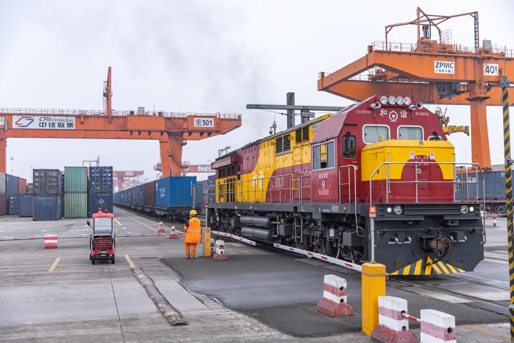 ??1月4日,在重慶萬(wàn)州新田港站,工作人員進(jìn)行集裝箱吊裝作業(yè),將專列貨物轉(zhuǎn)運(yùn)至公路物流環(huán)節(jié)。新華社記者 唐奕 攝