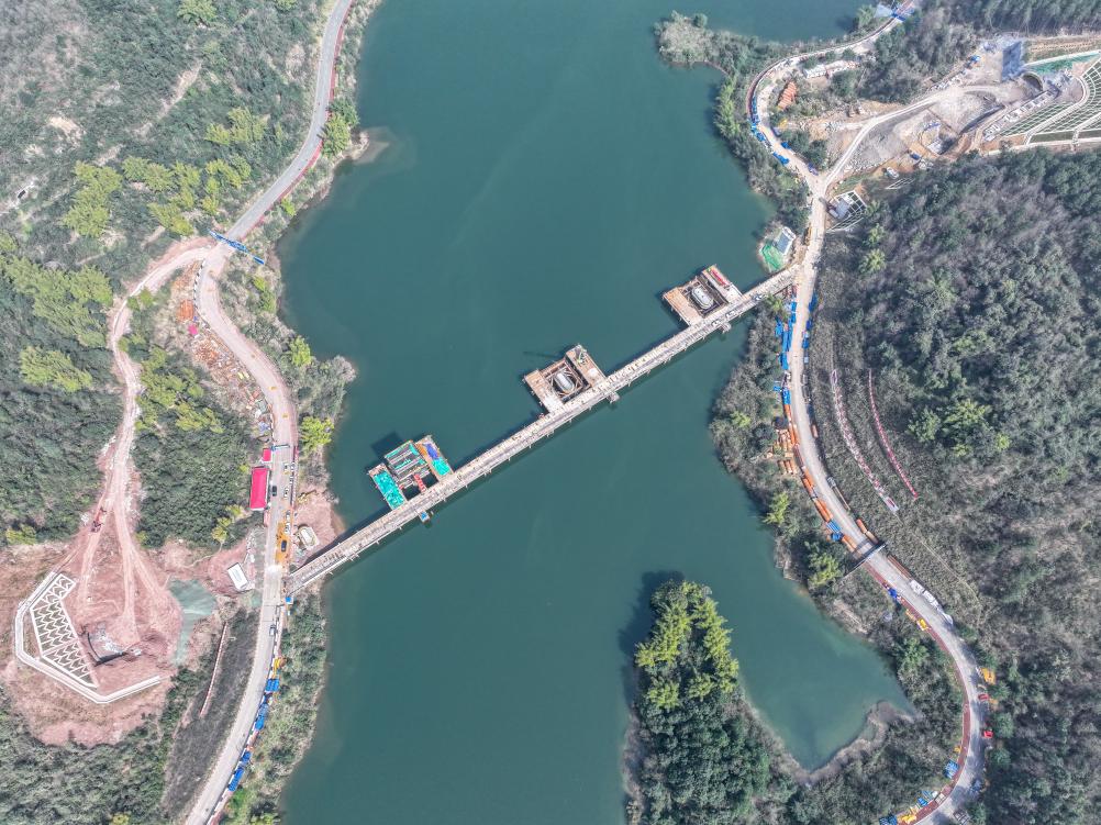 ??這是2月19日拍攝的位于重慶市銅梁區(qū)的成渝中線高鐵玄天湖大橋建設(shè)現(xiàn)場(chǎng)(無(wú)人機(jī)照片)。新華社記者 唐奕 攝