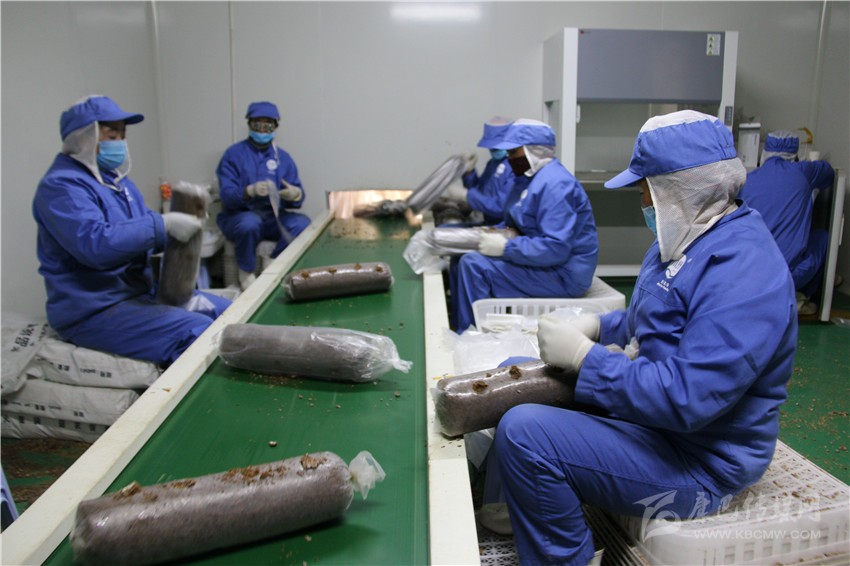 村民正在包裝菌棒。