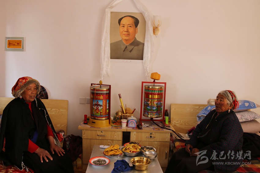 從餐廳出來(lái),記者走進(jìn)了一間15平方米左右的宿舍。兩位老人正坐在各自的木床上看電視,墻上掛著的液晶電視是連著機(jī)頂盒的。兩床之間,放著藏桌和床頭柜,藏桌上有瓜子、花生、酥油果子、牛肉等食品,亞瑪翁青老人熱情地說(shuō):“因?yàn)檎谶^(guò)藏歷新年,這些都是福利院為我們備的年貨,你也嘗嘗!”。房間里最引人注目的便是掛在床頭柜上方的系著哈達(dá)的毛主席畫像,兩位老人指著毛主席畫像動(dòng)情地說(shuō):“毛主席、共產(chǎn)黨是我們的恩人,看著他的畫像我們安心?!贝送?,房間里還有衣柜、配有馬桶的獨(dú)立廁所和盥洗臺(tái),毛巾、漱口盅、掃把、拖把都整齊地放在對(duì)應(yīng)位置。亞瑪翁青笑著說(shuō):“我們住的房間都趕得上縣城里的賓館了?!?/span>