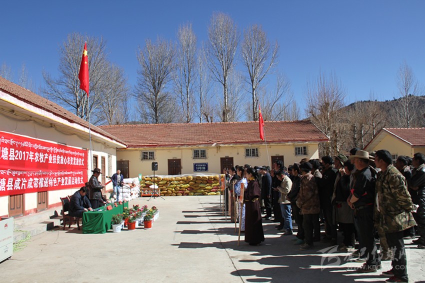在農科所院壩,擺放著縣委政府多方籌資,縣農牧和科技局調運和貯備脫毒馬鈴薯種60萬公斤,青稞良種30萬公斤、農膜10噸、肥料120噸、各類蔬菜油菜良種3000公斤,35萬元的黑木耳菌種,分發(fā)給24個鄉(xiāng)鎮(zhèn)、37個脫貧村。為趕這趟“理塘縣2017年農牧產業(yè)扶貧放心農資發(fā)放儀式”、“理塘縣成片成帶推進特色產業(yè)發(fā)展啟動儀式”,降央吉稱專門起了個大早,開著拖拉機“趕”了兩個小時到了農科所。