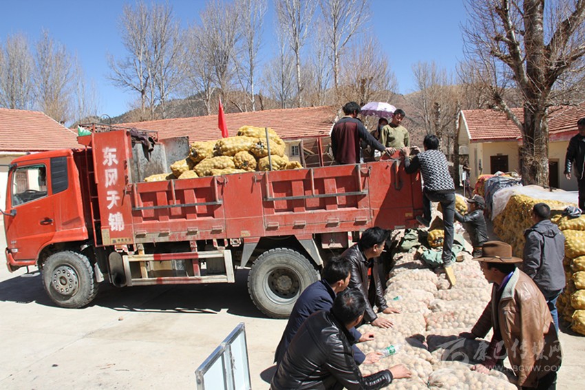 村民正在搬運免費發(fā)放的馬鈴薯等農用物資。