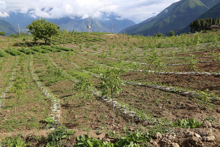 海子村種上連片的核桃樹苗。