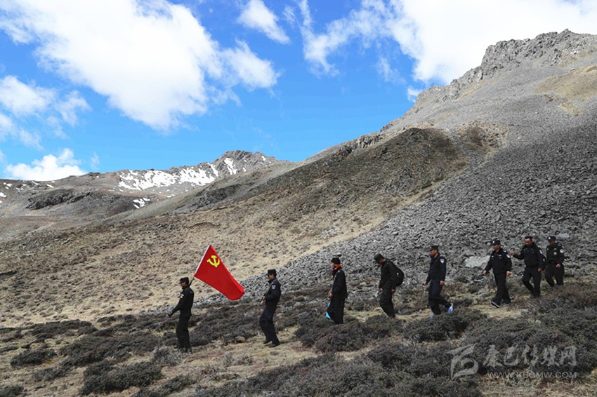 為確保蟲草采挖期間的社會治安穩(wěn)定,縣公安局抽調(diào)精干力量,前往哈幾山、莫庫溝等多個蟲草采挖點(diǎn)開展巡山維穩(wěn)。這次和我們一起開展常規(guī)巡邏的共有8名公安干警。降初是本地人,1.78米的個子,一路上,他高舉黨旗、步履矯健、勇往直前,成為我們大家的“領(lǐng)路人”,大家經(jīng)常和他開玩笑說:“跟著黨(旗)走永遠(yuǎn)不迷路”。