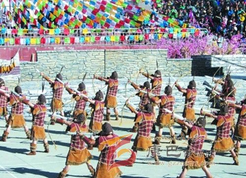 在催人奮進(jìn)的戰(zhàn)鼓聲中,一群身披甲胄的士兵拿著長(zhǎng)劍,背著巨弓走到臺(tái)前,在鏗鏘的戰(zhàn)鼓聲中,戰(zhàn)士們做著各種競(jìng)技動(dòng)作,模仿武士們互相攻擊的樣子,那矯健的身影展示了遠(yuǎn)古時(shí)代嘉絨藏族先民們?yōu)榱松媾c自然努力抗?fàn)幍膱?chǎng)景。過(guò)了一會(huì)兒音樂(lè)一轉(zhuǎn),戰(zhàn)鼓聲漸漸減弱,在鳥(niǎo)雀的陣陣啾啾聲中,一座木門(mén)慢慢的開(kāi)啟,一位身披長(zhǎng)袍、頭戴鳳冠的女王在眾多美女的簇?fù)硐拢従徸呦屡_(tái)階步入舞臺(tái)中央,此時(shí),一位手捧托盤(pán)的老者來(lái)到女王面前單膝下跪,將托盤(pán)高舉過(guò)頂,并邀請(qǐng)女王品嘗佳肴,女王將中指在酒中蘸了蘸,并曲起中指向四周輕輕彈去,寓意愿將杯中美酒與四方百姓同飲。在女王面前還放置著一個(gè)凈水桶,桶中盛滿了清澈的甘泉,桶上橫放著一枝柏樹(shù)枝,女王伸出纖纖玉手,拿著柏樹(shù)枝在水中蘸了蘸,面向墨爾多神山撒去,寓意向神山祈福。這是此次《美人谷·丹巴》節(jié)目展演中的序曲部分,有著強(qiáng)烈的東女神韻,將遠(yuǎn)古時(shí)代東女國(guó)女王遺風(fēng)展演的淋漓盡致。