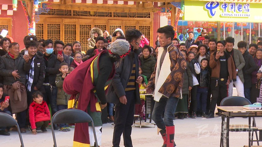 上午11點(diǎn),歡快的音樂(lè)在小學(xué)操場(chǎng)上響起,演出正式開(kāi)始。村民們圍坐在操場(chǎng)上,人頭攢動(dòng)、彩幡飛舞、陽(yáng)光正好。13個(gè)節(jié)目依次上演,包括男女群舞、女子群舞、男子合唱、女子合唱、男女獨(dú)唱,最有特色的是得榮本地特色群舞《雪域鍋莊》和《九步情》。