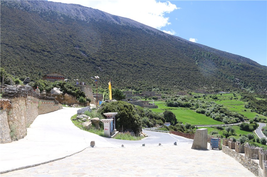 從觀景平臺向村子進(jìn)發(fā),一棟棟用石塊砌成的藏房次第映入眼簾,每一棟藏房都有獨(dú)立的院落,院墻上是堆放整齊的木柴,墻邊是造型別致的花臺,有的房頂上還掛著五星紅旗。走到村口,黑化通村路變成了硬化聯(lián)戶路,道路寬敞整潔,路旁有太陽能路燈、電子監(jiān)控、綠化花草和公共廁所;村中央的廣場上聚滿了人,他們有的是外來游客、有的是當(dāng)?shù)卮迕瘢械脑跁裰栭e聊,有的在對著美景拍照。在村里,記者還發(fā)現(xiàn)有幾個(gè)小賣部、不少私家車和好幾大片長勢良好的菜地,地里有一些人在勞作。