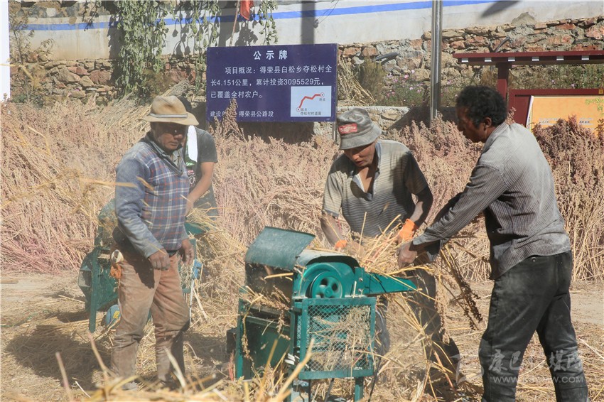 金秋的陽光熾熱溫暖,得榮縣白松鎮(zhèn)奪松村一片祥和安寧。11月10日,村民們正在村活動室的院壩里脫粒藜麥,豐收的喜悅寫在忙碌的村民的臉上?!按蠹壹佑透?,把藜麥交給公司,立馬可以拿到現錢?!眾Z松村委會副主任四郎都遷高興地說,盤點收成,今年又是一個豐收年。