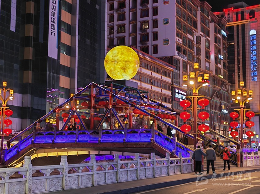 除了讓人眼前一亮的各種絢麗的花卉燈飾和被大紅燈籠、如意掛飾的大街小巷,最被市民津津樂道的莫過于中橋的明月景觀和東關(guān)U形廣場上的“五彩色神?!薄C髟戮坝^又稱《世界的康定》,此景觀以月球?yàn)橹黧w,在橋兩側(cè)再輔助以音符及五線譜造型。其寓意為情歌唱響世界,康定名揚(yáng)世界。而矗立在東關(guān)廣場上的新增雕塑景觀就更意義非凡了。雕塑通體是以一頭雄壯的牦牛形象呈現(xiàn),牦牛下方的紅色高臺正前方鐫刻的是政府公仆一心為民的錚錚誓言?!罢臓I造喜慶洋洋的節(jié)日氛圍,讓我們感受到了濃濃的‘年味’,在黨和政府的關(guān)懷下,我們老百姓的生活一年更比一年好,幸福感也是一年更比一年強(qiáng)。”75歲高齡的扎西激動(dòng)地跟記者分享著他的喜悅。