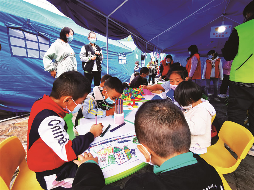 “這頂帳篷中充滿了孩子們的歡聲笑語,這在地震災(zāi)區(qū)就是最動(dòng)聽的聲音?!惫睬鄨F(tuán)甘孜州委統(tǒng)戰(zhàn)社會(huì)聯(lián)絡(luò)部部長澤仁娜姆介紹,地震發(fā)生后,團(tuán)州委第一時(shí)間組織3193名志愿者,24支青年突擊隊(duì)參與應(yīng)急志愿者工作,并在磨西鎮(zhèn)貢嘎廣場分配38名志愿者參與后勤保障工作,其中5個(gè)人便成為了“青青兒童樂園”里的“保育員”,“孩子們可以在這里畫畫、做游戲,還能在老師輔導(dǎo)下學(xué)習(xí),他們不安的情緒也得到安撫,臉上的恐懼也逐漸被微笑取代。”