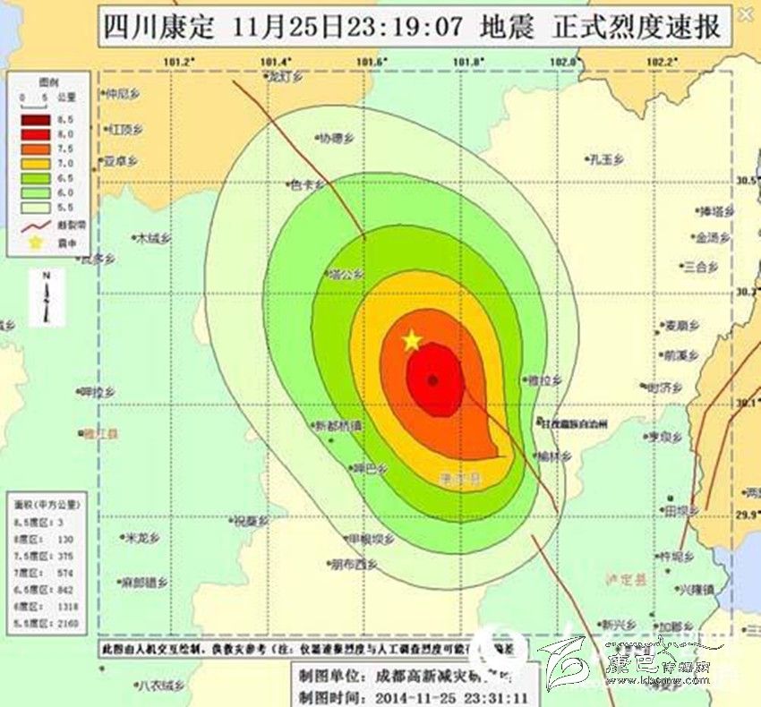 據(jù)人民網(wǎng)成都11月26日報(bào)道 記者剛剛從成都高新減災(zāi)研究所了解到,11月25日23時19分在四川省甘孜藏族自治州康定縣(北緯30.2度,東經(jīng)101.7度)發(fā)生5.8級地震,此次地震系康定6.3級地震的余震。