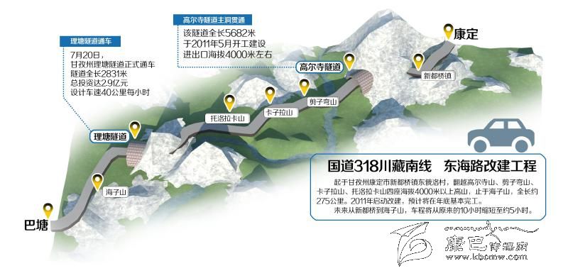 國道318川藏南線是四川進(jìn)藏大通道之一,也是甘孜藏族自治州境內(nèi)極其重要的交通主干道之一。2011年啟動(dòng)建設(shè)的東海路改建工程,按三級(jí)公路標(biāo)準(zhǔn)改建,起于甘孜州康定市新都橋鎮(zhèn)東俄洛村,翻越高爾寺山、剪子彎山、卡子拉山、托洛拉卡山四座海拔4000米以上高山,止于海子山,全長約275公里。