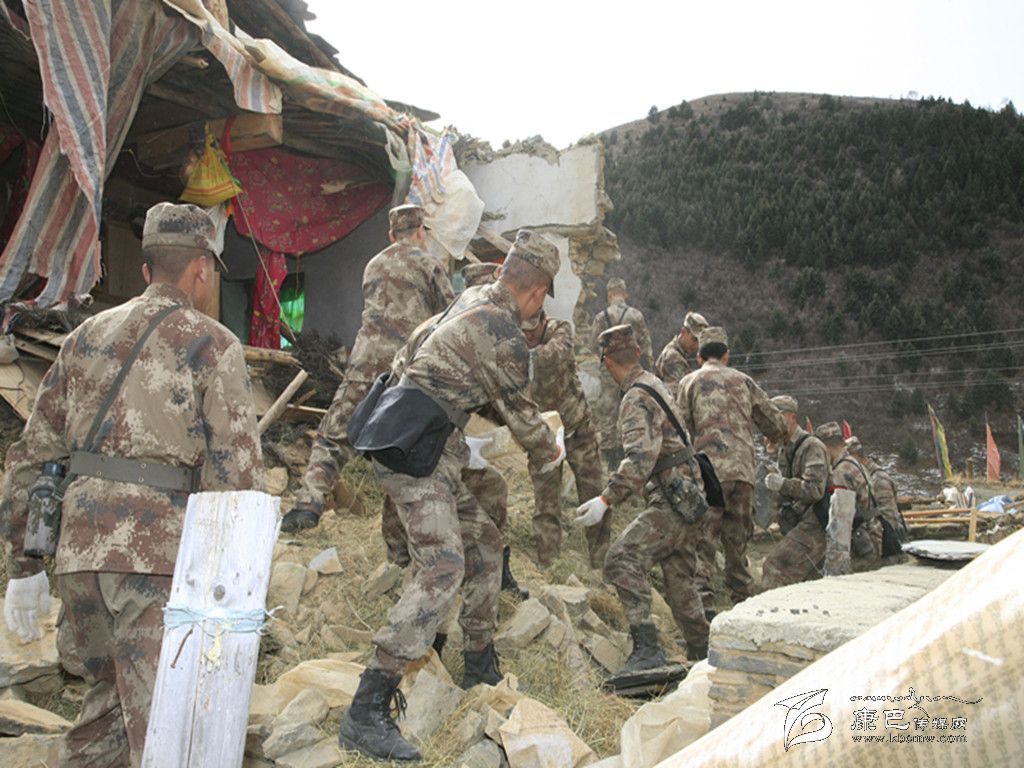 甘孜軍分區(qū)官兵為康定地震災(zāi)區(qū)清理坍塌建筑。