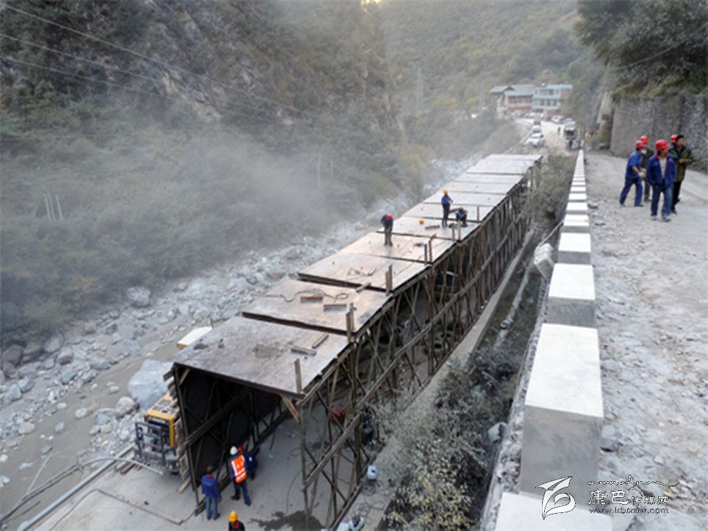 針對山體崩塌及道路受阻情況,甘孜水電公司與有關(guān)參建單位就隧道搶通、防護網(wǎng)安裝等多個防護搶通方案進行了比選和論證,確定了架設(shè)鋼結(jié)構(gòu)棚洞應(yīng)急保通方案,并用8天時間高效快捷地完成了78米長的一期防護棚洞建設(shè),使湯壩土料場公路具備臨時通行條件,緩解了山體崩塌給當(dāng)?shù)厝罕娚a(chǎn)生活造成的影響,切實履行了央企的社會責(zé)任,有效降低了山體崩塌對長河壩工程建設(shè)的進度影響。
