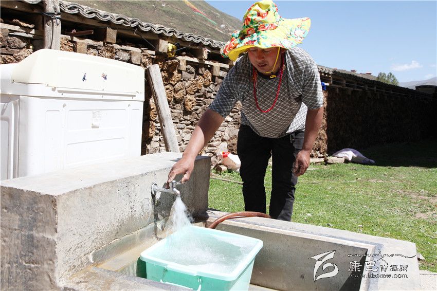 這是一幢位于半山坡上的漂亮藏房,這是一座寬敞干凈的農(nóng)家院落。正在院子里的水龍頭前洗衣服的布窮拉,一面羞紅著臉招呼著我們,一面將洗衣粉撒進(jìn)洗衣機(jī)里,高速運轉(zhuǎn)的洗衣機(jī)不時拋出幾朵洗衣粉泡沫。說起自來水,不善言辭的布窮拉確實感觸尤深:“我家附近只住了4戶人家,根本就沒想過這輩子還能用上自來水。去年鄉(xiāng)上在實施第二批人口安全飲水工程項目時,居然也把我們幾家規(guī)劃進(jìn)去了。當(dāng)時,我以為只是說說而已,沒想到20來天后施工隊果真就把水管鋪設(shè)到了我家。通水那天,我們幾家人還特意慶祝了一盤。如今,我再也不用每天往返到色曲河背水了,我家的背水塑料桶隨之也就‘下崗’了。”