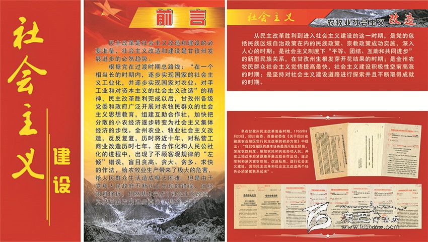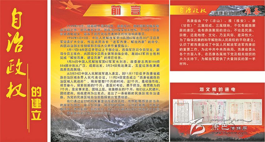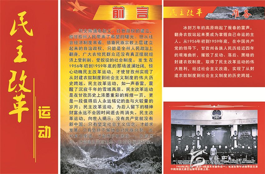 《甘孜州檔案館愛國主義教育基地》的整個展覽分為四大板塊。第一部分命名為“自治政權的建立”,向參觀者介紹了甘孜藏族自治州誕生的歷史過程;第二部分是“民主改革運動”,把人們帶回了那段不能忘記的烽火歲月;第三部分是“社會主義建設”,深情地回顧了在建設社會主義事業(yè)中我州所取得的不平凡的成就;第四部分是“改革開放”,讓人們重溫了在改革開放的大潮中所經歷的那些充滿激情的經歷。