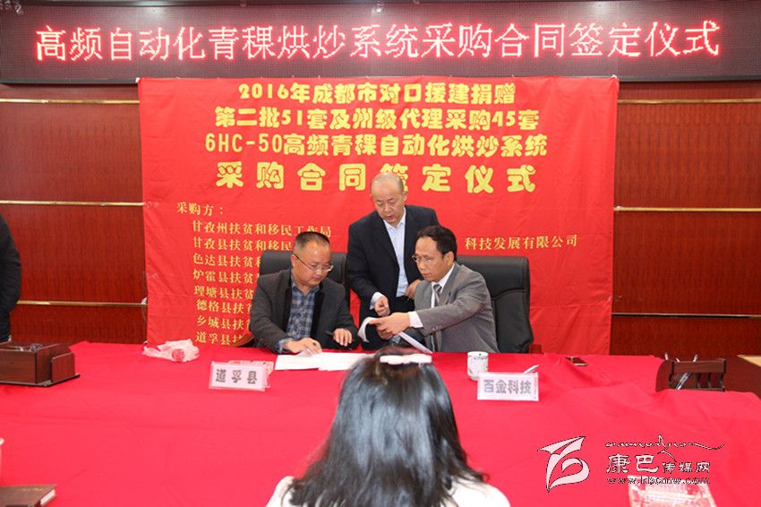 本網(wǎng)訊(記者 宋志勇 文/圖)10月28日,2016年成都市對(duì)口援建捐贈(zèng)第二批51套及州級(jí)代理采購(gòu)45套6HC-50高頻青稞自動(dòng)化烘炒系統(tǒng)采購(gòu)合同簽定儀式在康定舉行。州扶貧移民局和甘孜、色達(dá)、爐霍、理塘、德格、鄉(xiāng)城、道孚七縣扶貧移民局與百金(成都)科技發(fā)展有限公司簽訂了采購(gòu)合同。