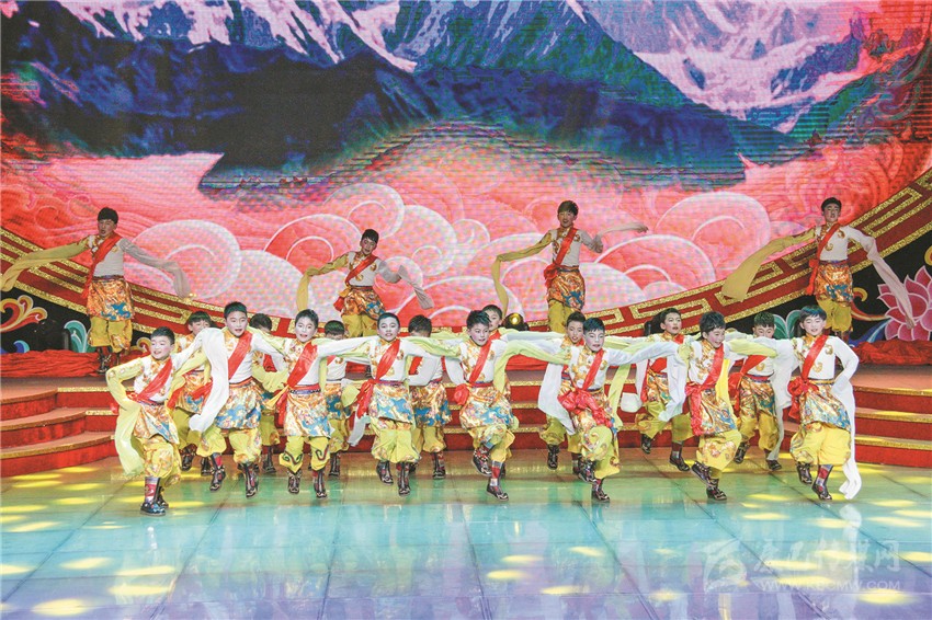 在團拜會節(jié)目演出環(huán)節(jié),隨著主持人一句“柳綠枝頭待燕歸,金雞賀歲開門紅”脫口而出,20余名活潑、歡快的少年涌上舞臺,就著音樂的節(jié)拍,揮手踏足、左挪右轉(zhuǎn),翩翩起舞;少年們舞動的長袖映著縷縷斑斕的光束,依如雄鷹在拍打著飛翔的翅膀。這便是此次演出的開場節(jié)目《雛鷹飛翔》,一場絢麗多彩的“甘孜春晚”由此火熱開演。隨后,一群體態(tài)輕盈、妝如仙鶴的女子用靈動的舞姿為甘孜祈福,點明了此次團拜會的一大主旨——祝福甘孜。