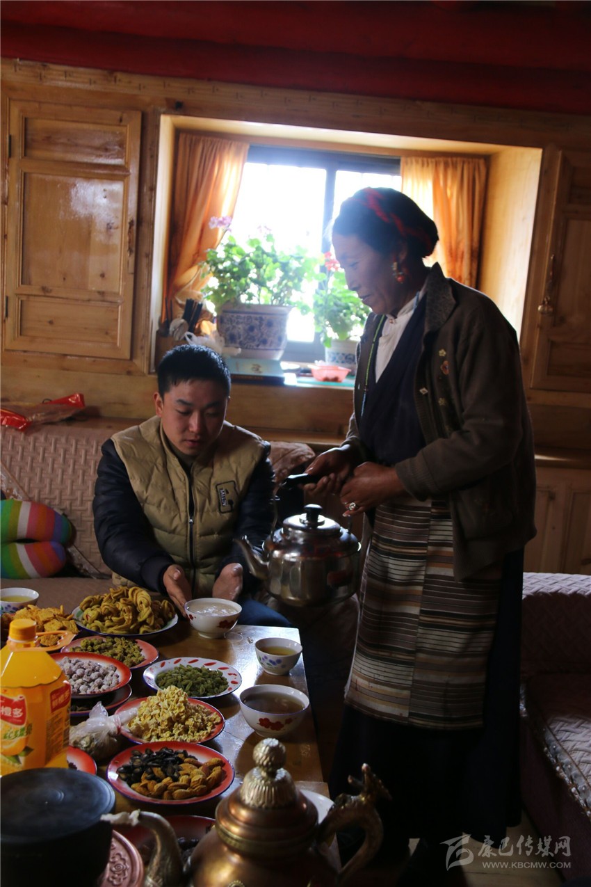 國道350線旁,一扇鐵門輕掩蓋,門內(nèi)飄來陣陣肉香;幾聲犬吠過后,一名穿戴整潔的藏族婦女走了出來;隨行的村支部書記澤吉告訴記者這就是曲珍,今年計(jì)劃脫貧的貧困戶。跟隨曲珍走進(jìn)一間房屋,出現(xiàn)在記者眼前的是一個藏漢風(fēng)格結(jié)合的客廳:地面和天花板都由光亮的木質(zhì)建材裝飾,對門的墻面上有一個木質(zhì)展示架,架上規(guī)整地陳列著仿真鮮花、盆景、瓷質(zhì)茶杯和高腳杯。要不是架上還放著幾個藏式茶壺和旁邊的藏桌、藏床,記者還以為是走進(jìn)了一個漢族城市家庭的客廳。