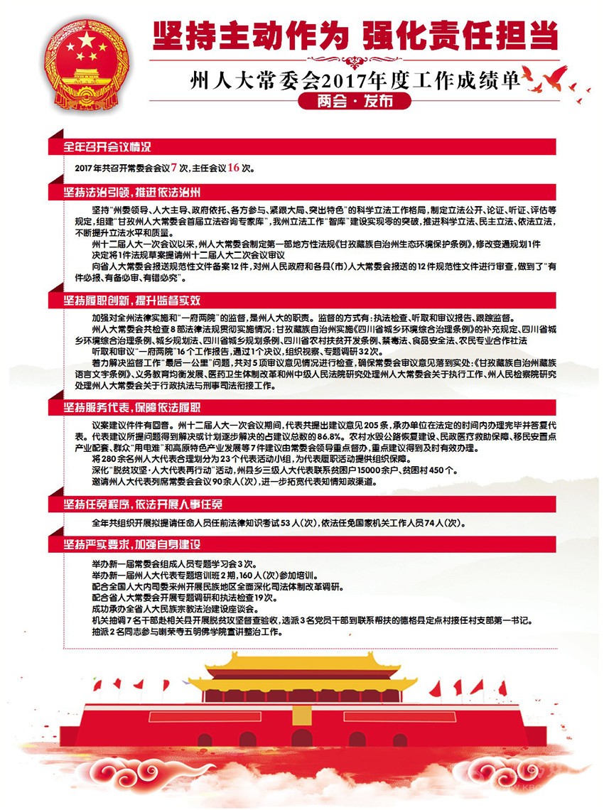 2017年是州十二屆人大常委會各項工作的開局之年,在中共甘孜州委的堅強(qiáng)領(lǐng)導(dǎo)下,常委會圍繞中心,服務(wù)大局,依法履職,圓滿完成了州十二屆人大一次會議確定的各項工作任務(wù)。