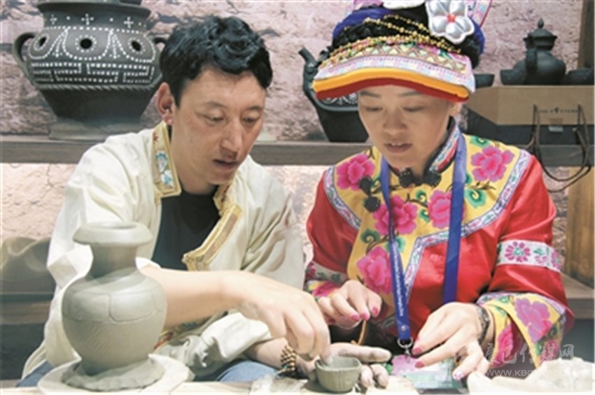 游客向非遺傳承人學習阿西土陶制作工藝。
