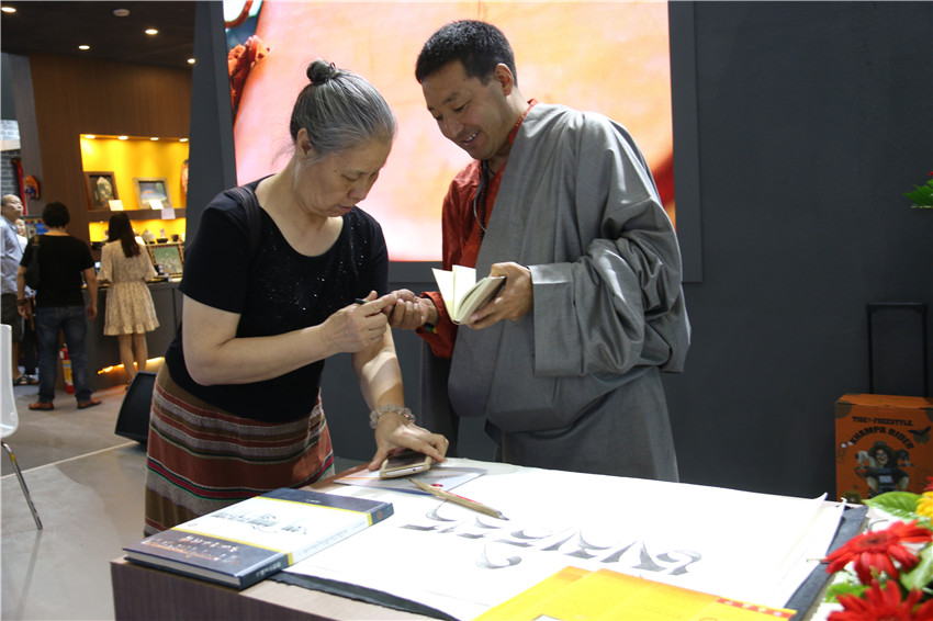 而在同一地點(diǎn)的另一側(cè),省級藏文書法傳承人巴松鄧珠的藏文書法也吸引著眾多愛好書法市民前來觀賞,還有的與他合影。“指導(dǎo)過我的書法家非常多,他們不僅給了我許多寶貴的意見,更重要的是給了我信心和動力,讓我堅持寫書法,并成為康體藏文書法的傳承人?!卑退舌囍檎f,這次能夠得到州委、州政府搭建的平臺,我會珍惜好這次難得的機(jī)遇,把作品展示好、宣傳好,讓全國各地的人們更多地了解我州民族文化。