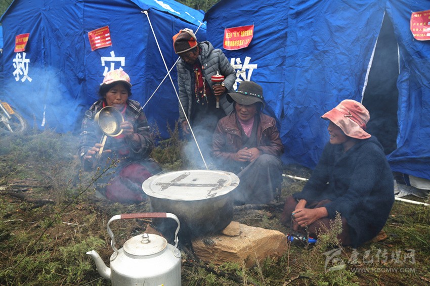 曲珍、曲西和幾個(gè)伙伴正在燒著開(kāi)水?!斑@是到安置點(diǎn)后我第一次生火。前兩天吃干糧喝礦泉水,讓喝慣了酥油茶的我們很不適應(yīng)?!鼻湔f(shuō)。
