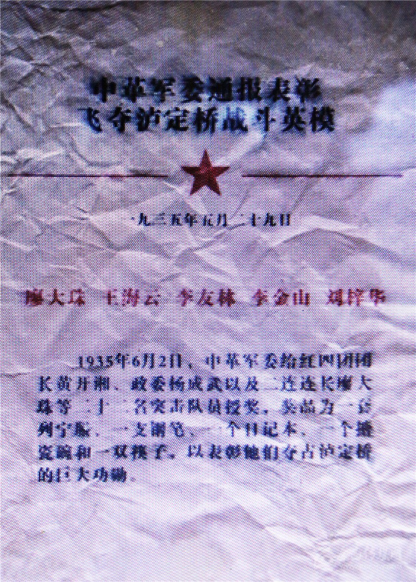 劉東升談起父親當(dāng)年作為飛奪瀘定橋22勇士之一,心情無(wú)比激動(dòng)。“父親當(dāng)年如果不是努力爭(zhēng)取,就沒(méi)有后來(lái)的勇士稱號(hào),更沒(méi)有中革軍委的嘉獎(jiǎng)?!?935年5月,北上抗日的紅軍向天險(xiǎn)大渡河挺進(jìn)。大渡河水流湍急,兩岸都是高山峻嶺,只有一座鐵索橋可以通過(guò)。這座鐵索橋,就是紅軍北上必須奪取的瀘定橋。