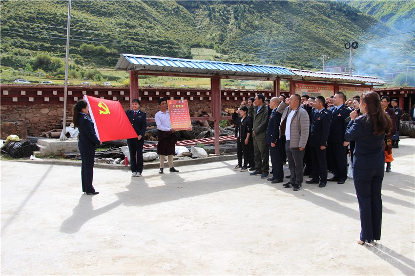 9月18 日,理塘縣稅務(wù)局黨委、局機關(guān)黨支部聯(lián)合該縣覺吾鄉(xiāng)黨委、覺吾鄉(xiāng)四合村黨支部共同開展了“不 忘初心、牢記使命”主題教育和“守初心、擔(dān)使命、聚四合、謀發(fā)展”主題黨日活動。圖為全體黨員重溫入黨誓詞。 理塘縣委中心報道組 葉強平 張樹義 攝影報道