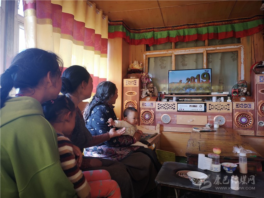 甘孜縣斯俄鄉(xiāng)日安村貧困戶布益洛和家人收看慶祝大會(huì)直播。