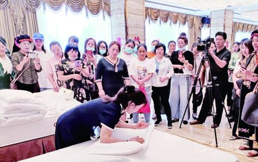 先檢查床箱與床墊是否吻合,床墊拉出40公分,鋪床前撣去床上毛發(fā),接下來(lái)開(kāi)始甩單,床單正面朝上,床單中線居中,兩邊吊邊均等,甩單動(dòng)作簡(jiǎn)單瀟灑,準(zhǔn)確到位。這是7月8日,稻城縣文旅行業(yè)從業(yè)人員培訓(xùn)會(huì)上,筆者見(jiàn)到學(xué)員在教師的指導(dǎo)下表演的精彩一幕。