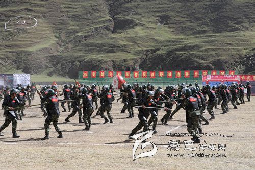 在實(shí)戰(zhàn)技能演練中,各單位都表演了自己的拿手絕技:由武警甘孜州支隊(duì)雪山飛虎隊(duì)20名官兵演練的特種射擊;武警四川總隊(duì)第二支隊(duì)演練的格斗術(shù);中國(guó)人民解放軍甘孜軍分區(qū)獨(dú)立營(yíng)120名官兵演練刺殺操;武警甘孜支隊(duì)一大隊(duì)和三大隊(duì)200名官兵演練的防暴對(duì)抗;雪山飛虎隊(duì)隊(duì)員帶來(lái)的硬功表演;州公安局特警支隊(duì)特警演練的“雪狼十七式”、摔擒配套動(dòng)作、實(shí)戰(zhàn)對(duì)抗。據(jù)了解,“雪狼十七式”是甘孜公安特警通過(guò)六年來(lái)在高原維穩(wěn)駐訓(xùn)、處置突發(fā)事件,摸索出來(lái)的摔擒動(dòng)作,具有極強(qiáng)的殺傷力,能瞬間制敵。它是我州特警隊(duì)員實(shí)戰(zhàn)中克敵制勝的法寶,是特警隊(duì)員必備的基本功。