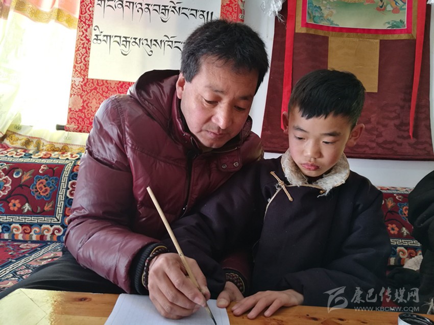 圖為巴松鄧珠手把手教孩子們藏文書法。