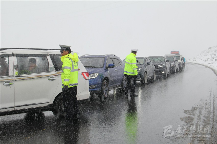 圖為交警在折多山指揮車輛有序通行。 易明軍 攝