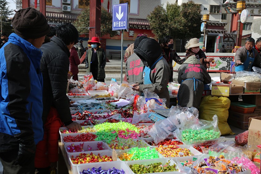 來自格西鄉(xiāng)的青志巴姆買了一大堆糖果,又到塑料制品攤點與攤主討價還價,用30元買了一個糖果盒?!耙酝枪S便放在桌上,既不好看又不衛(wèi)生;現在條件好了,也該講究講究?!彼嬖V記者,農村集市貿易活動辦得好,商品集中,家里的年貨在集市里就辦齊了。