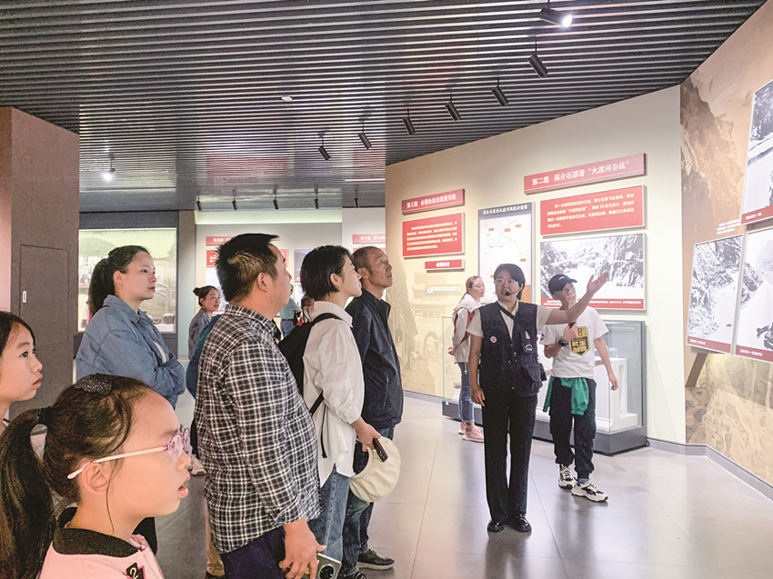 “國慶節(jié)的心情若有顏色,一定是紅色。瀘定作為一座紅色之城,擁有數(shù)不勝數(shù)的珍貴‘紅色寶藏’,這里有無數(shù)的紅色故事可以講述,也有光榮的革命精神在悠久傳承?!闭跒o定橋東橋頭排隊(duì)檢票的重慶游客李先生表示,他們一家?guī)е谏闲W(xué)六年級(jí)的兒子利用“雙節(jié)”假期,到瀘定體驗(yàn)“紅色文化研學(xué)”線路,從書本到現(xiàn)實(shí),走上瀘定橋接受紅色教育,感受長征精神。