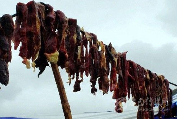 藏族同胞喜歡吃風干的牛羊肉。風干肉一般在冬天的十一月底制作。這時候的氣溫都比較低,在零度以下,把牛、羊肉割下來,掛在陰涼的地方,讓其風干,去出水份。藏民把牛、羊肉割成小塊串上,或用竹籠掛在帳房、屋檐下的陰涼處,第二年的三月之后,將早已風干的肉取來烤食或者直接生食,咀嚼時無渣塞牙。在高寒地區(qū),食品不易霉爛變質(zhì),去水又保鮮,故時至今日,吃風干牛肉之風仍盛行。