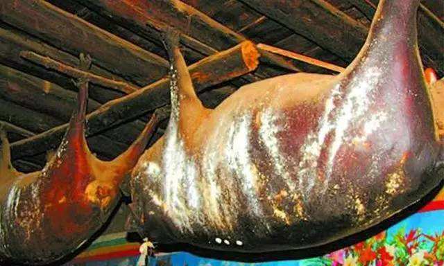 康南則用繩將豬勒死,讓血存于體內(nèi),然后用草點(diǎn)火去毛,于肛門處割一孔,取出內(nèi)臟,用干草或麥子等塞入豬腹內(nèi),用針縫合,縫口處用灶灰摻水?dāng)嚭铣珊芊?,掛在室?nèi),待其發(fā)酵,產(chǎn)生臭味時食用,稱“臭豬肉”。