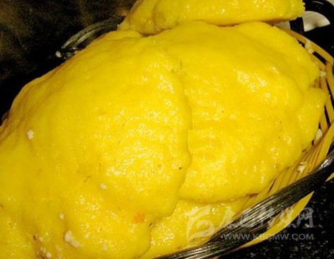 玉米饃是爐城平常人家常食的,就是許多做小生意開小攤鋪,常蒸食玉米饃。雅安人彭大春夫婦,早年曾在康定幫人干活,夫婦善做小吃。爐城大米昂貴,知爐城愛吃玉米,又愛吃“焦粑”(一種以面粉起酥肉餡炕餅的小吃)習(xí)慣,用金鉤鮮肉做餡,仿效“焦粑”的做法,用上等玉米面,創(chuàng)造出玉米面包金鉤炕餅,以其香、咸酥、脆味長誘人,食者排隊(duì)購買,風(fēng)行一時。